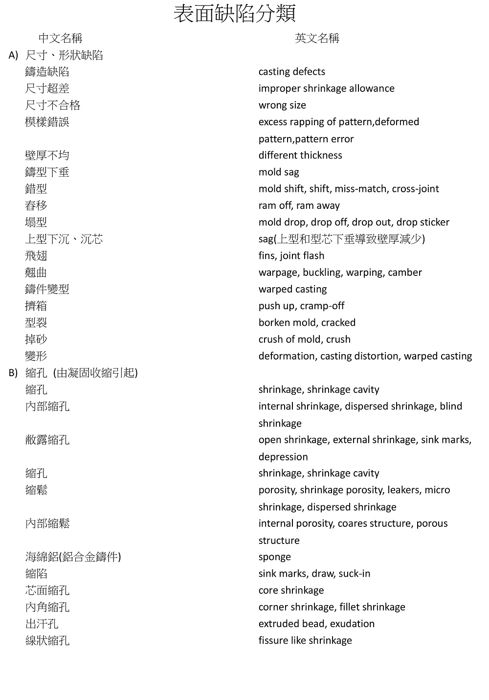 中英日鑄疵名詞對照